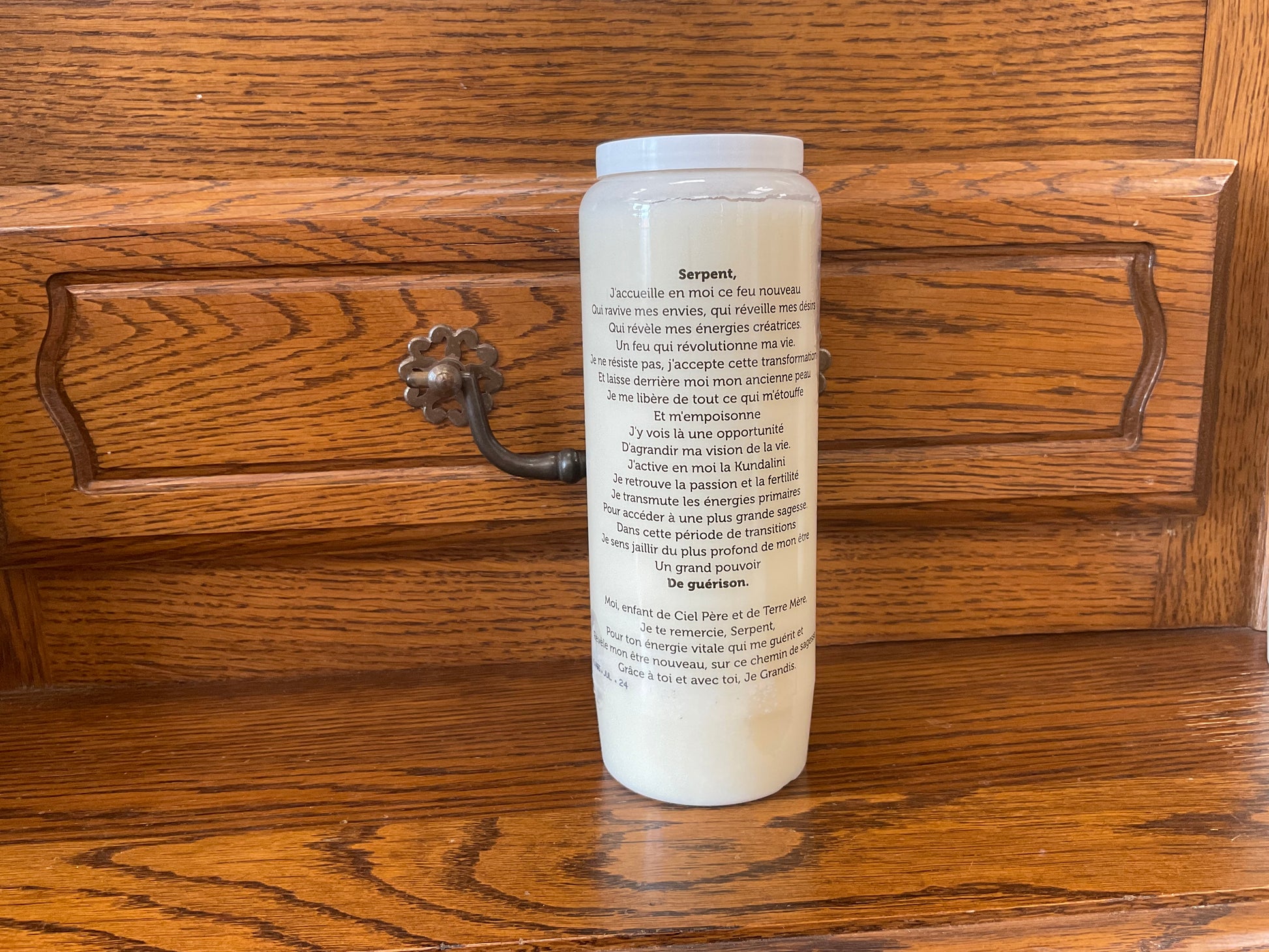 Texte d’invocation (au dos de la bougie) : un message puissant pour accompagner les transitions de vie, éveiller les énergies dormantes, libérer les blocages et accueillir une renaissance énergétique.