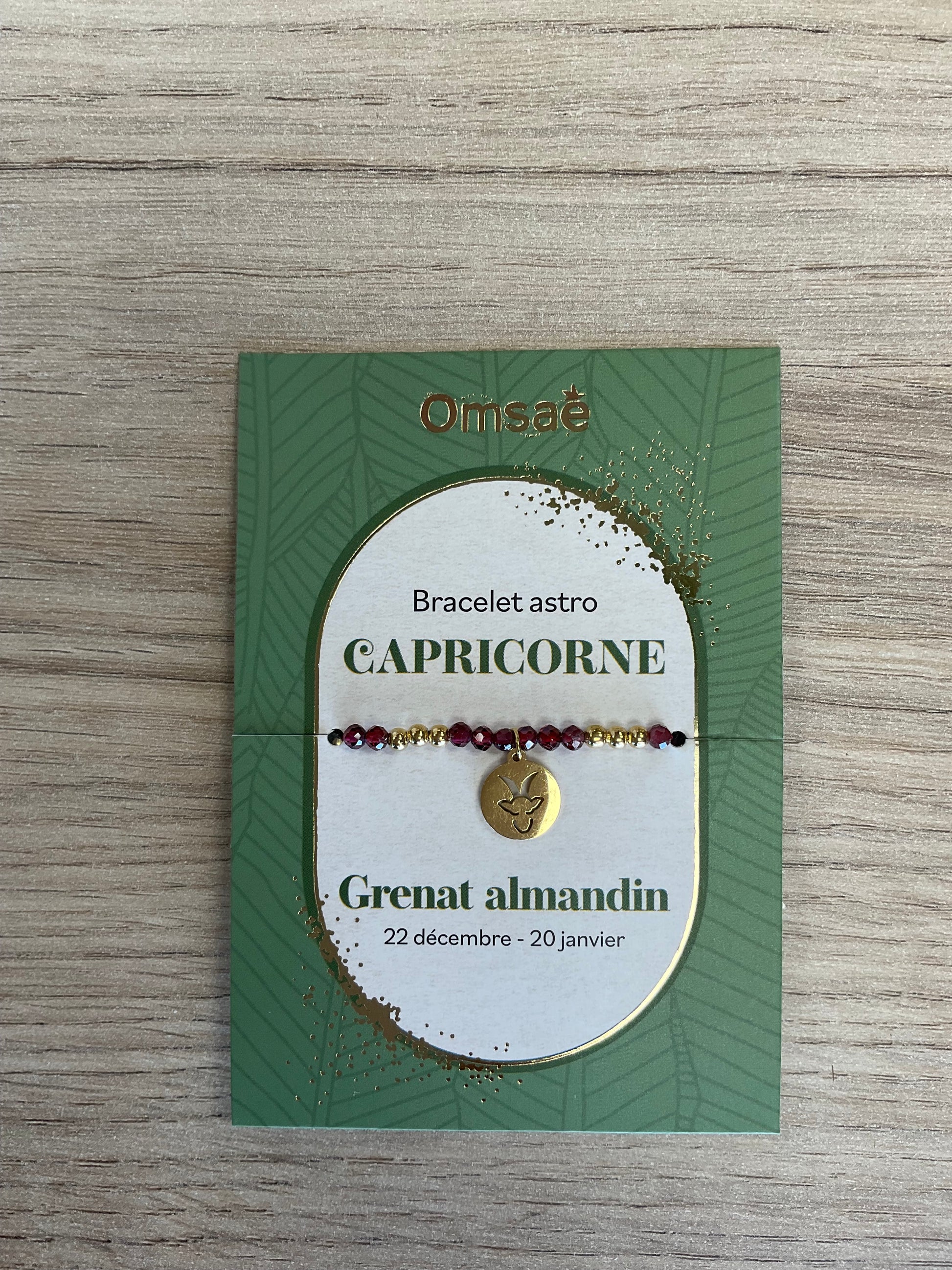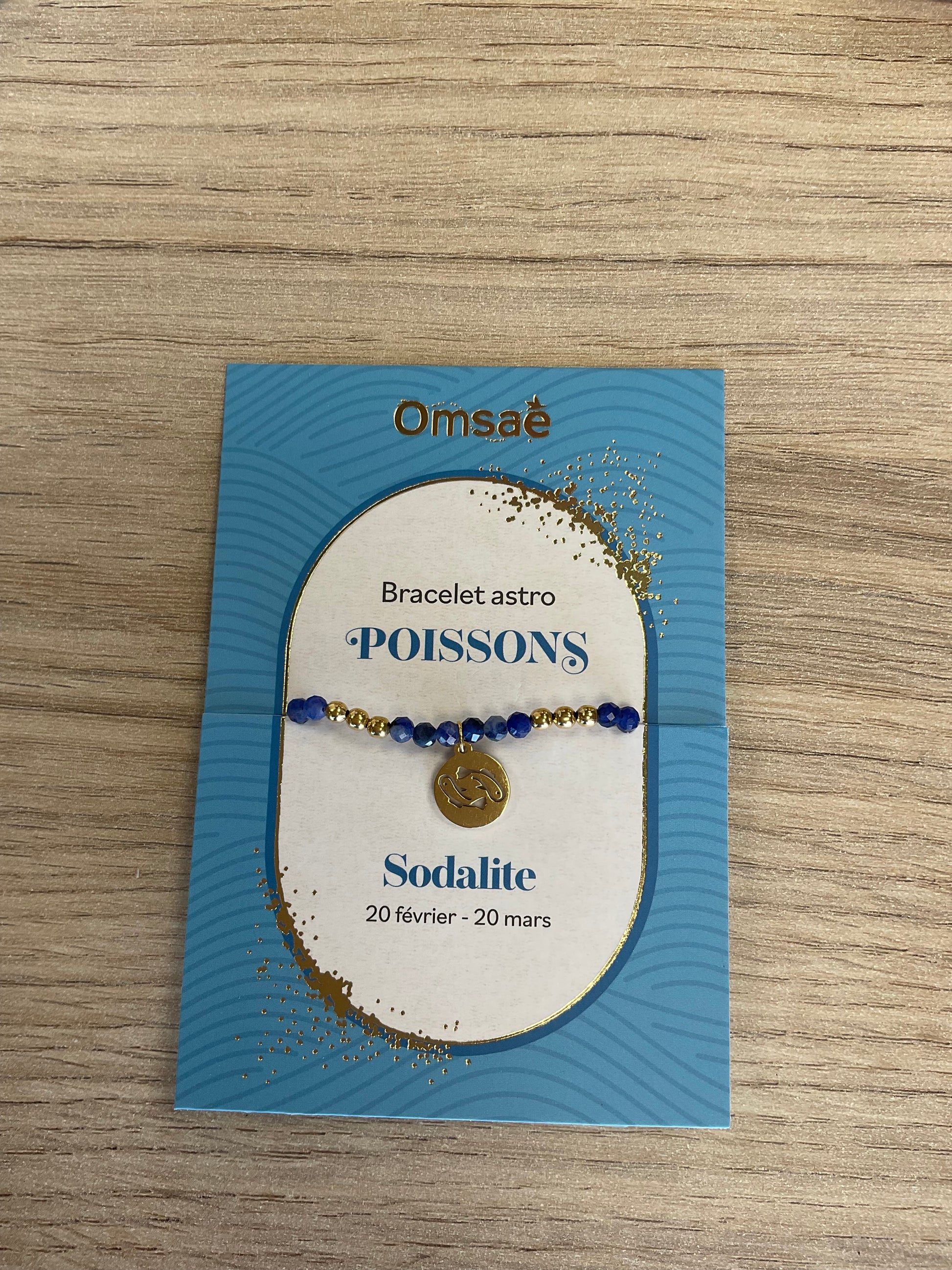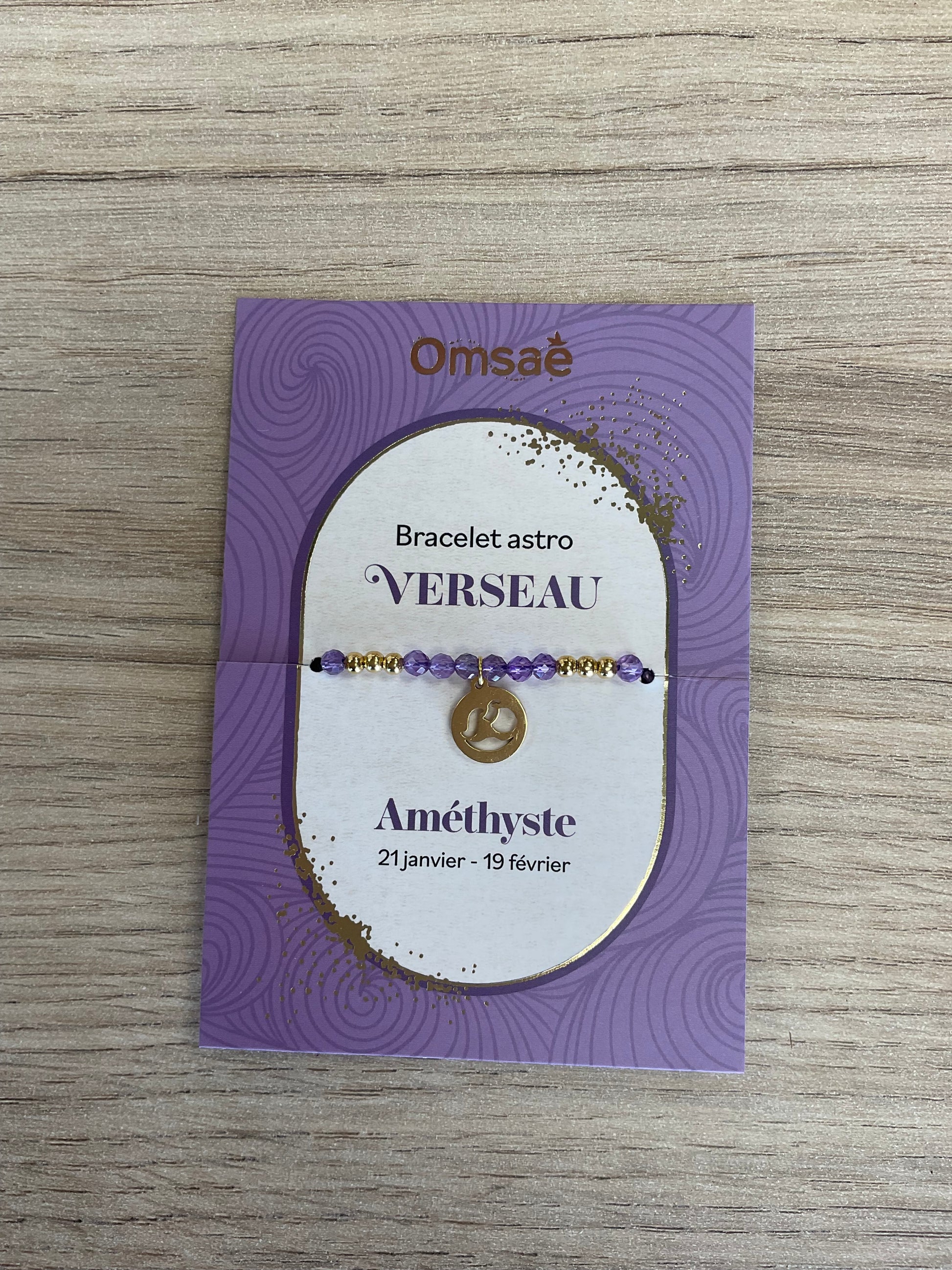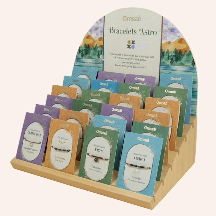 Chaque bracelet est présenté sur une jolie carte illustrée, indiquant le signe astrologique et la pierre associée.